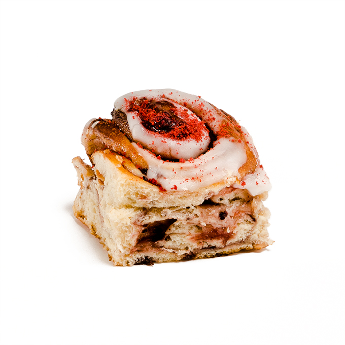 Enrotllat amb el nostre farcit de canyella i fruits vermells i cobert amb un suau glacejat.